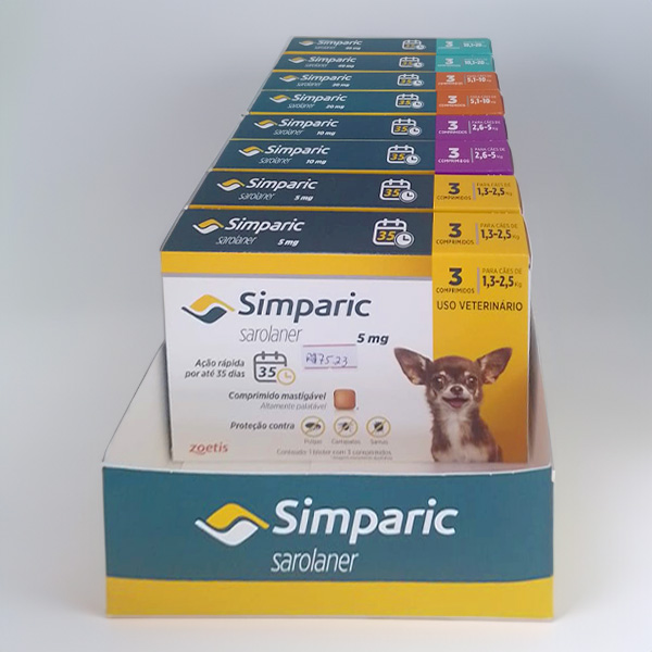 A linha de antipulgas e carrapatos da Zoetis, por exemplo, conta com seis opções de medicamentos, cada um indicado para uma faixa etária de peso diferente. O Simparic 20mg é indicado para cachorros que pesam entre 5,1 a 10kg.